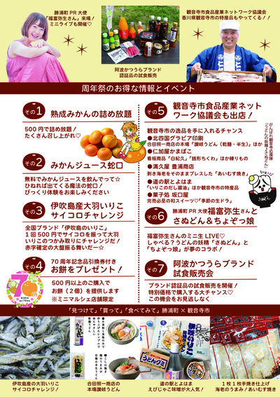 勝浦熟成みかんの詰め放題(500円)と伊吹島産いりこのサイコロチャレンジ(500円)をはじめ、みかんジュースの蛇口やミニマルシェ購入者にお餅をプレゼントします。
