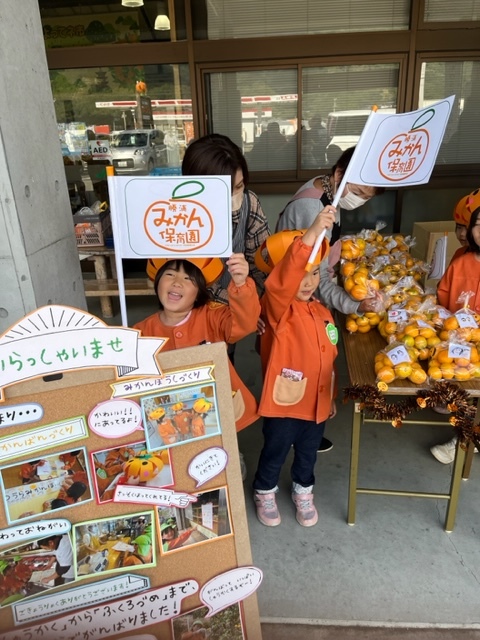 みかん保育園の子供たちが、自分たちで収穫したみかんをよってネ市前で販売しました。
